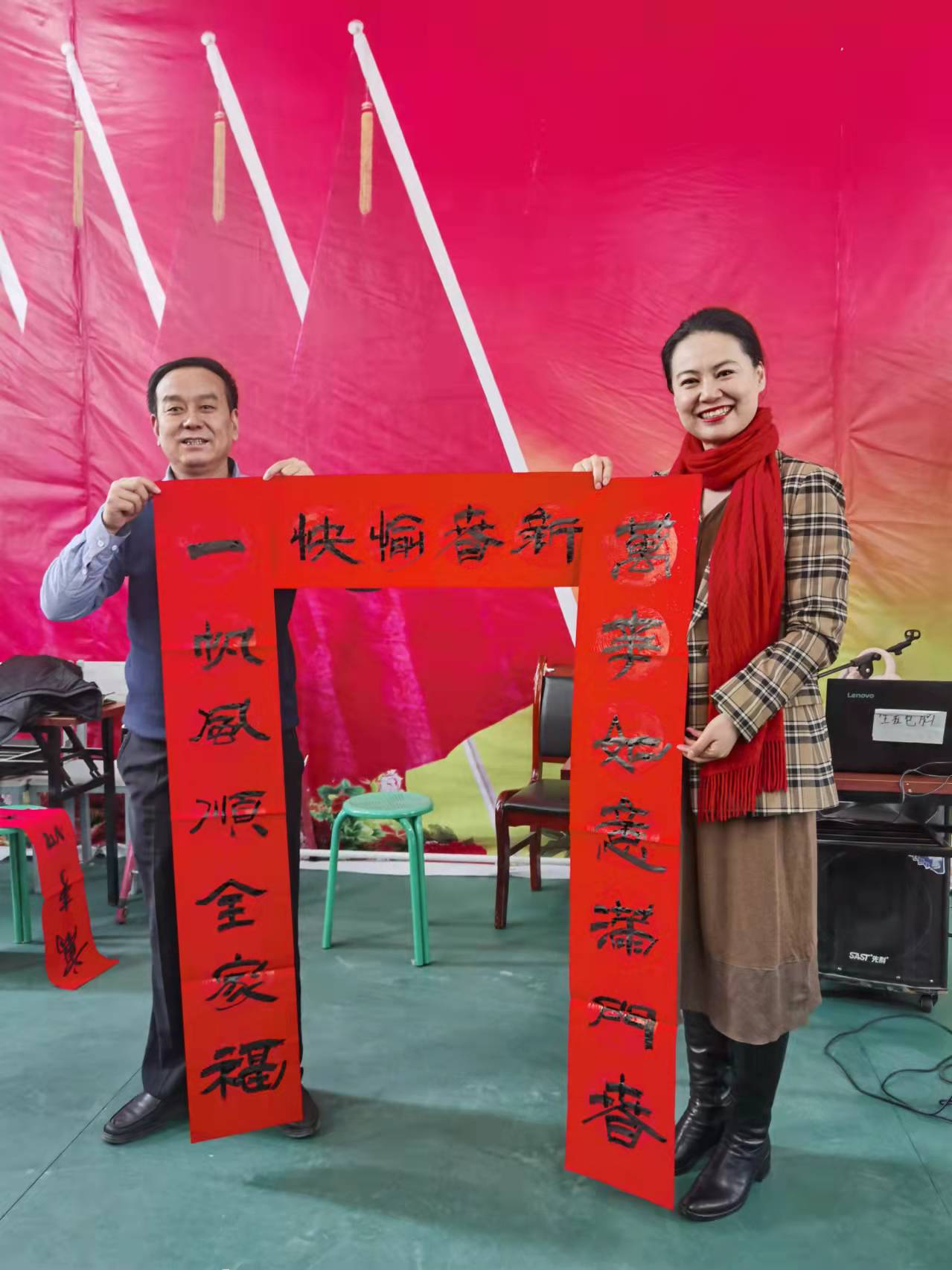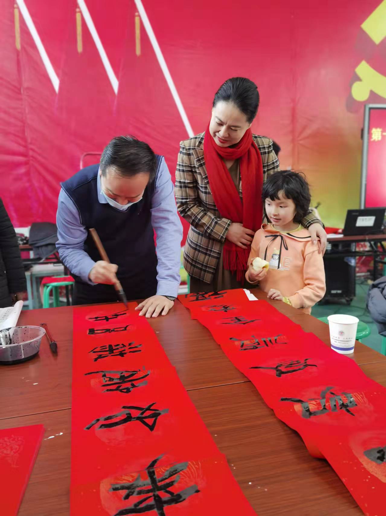 活動現(xiàn)場,書法家們揮毫潑墨,高雅的書法作品,紅彤彤的春聯(lián)增添了喜慶的“年味”。