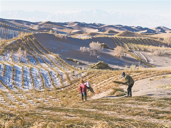 12月13日,施工人員在庫姆塔格沙漠鋪設(shè)沙障。