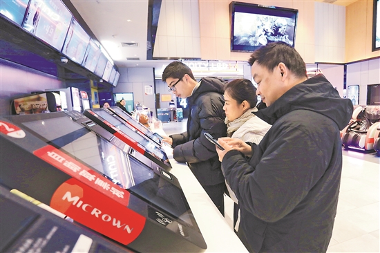 12月14日,在浙江省嘉興市南湖區(qū)一家影城,觀眾正在取票準(zhǔn)備觀影。