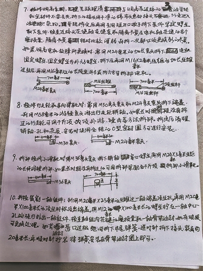 穆運喜手寫的采煤機檢修流程。受訪者供圖