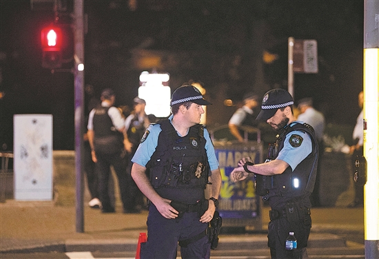 當(dāng)?shù)貢r(shí)間12月14日,在澳大利亞悉尼,警察在邦迪灘槍擊事件附近區(qū)域執(zhí)勤。