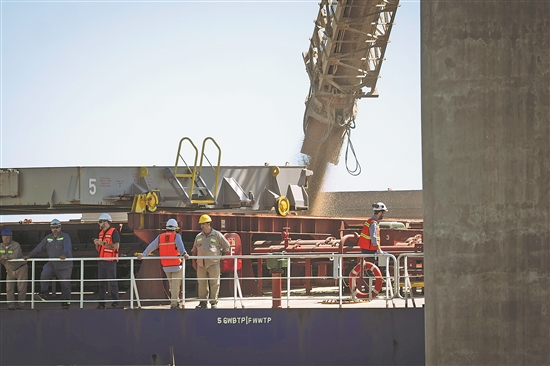 圖為近日在阿根廷圣菲省廷布埃斯港,工作人員在一艘裝載阿根廷小麥的貨輪旁工作。