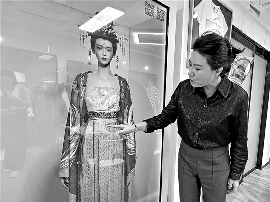 姜釗創(chuàng)新工作室設(shè)計的數(shù)字人“錦”身高1.7米,神態(tài)栩栩如生,服飾雍容華貴,紋理纖毫畢現(xiàn)。本報記者 程莉莉 攝