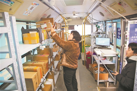 12月11日,江蘇省如皋市如城街道,居民在華府御庭小區(qū)西門的公交快遞驛站內(nèi)自助取件。驛站由“退役”公交車改造而成,拆除座椅加裝智能貨架與燈條系統(tǒng),居民掃碼取件時(shí)燈條閃爍提示,高拍儀自動(dòng)核驗(yàn),全程無(wú)接觸。本報(bào)通訊員 徐慧 攝