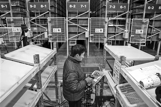 在智慧倉內(nèi),包裹都會被放置在統(tǒng)一規(guī)格的料箱內(nèi),機器人通過系統(tǒng)指令在貨架上拿取料箱,高度下降后,地面的無人自動搬運車將把存放在緩存區(qū)的料箱取下,按照設定好的線路將料箱運送至工作站。據(jù)工作人員介紹,智慧倉在提升倉庫空間利用率的同時可以大大提升揀貨效率,其作業(yè)坪效是傳統(tǒng)自動化倉儲的2.5倍。